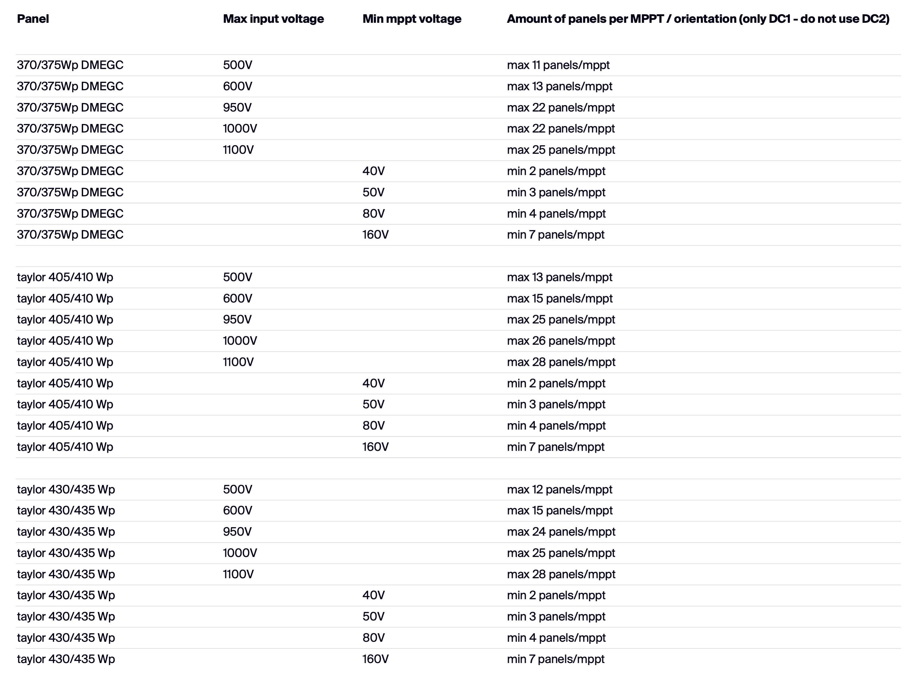 Below table shows information on the amount of panels you can or should use per MPPT on your inverter. Maximum amount of panels depends on your maximum input voltage of your inverter, minimum amount of panels needed depends on your minimum MPPT voltage.